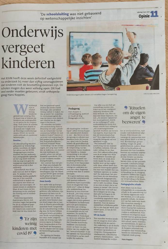 NHD – Noordhollands Dagblad digitale krant: Het onderwijs is tijdens de coronacrisis in paniek de kinderen vergeten, vindt orthopedagoog Hans Koppies. Hoog tijd voor gezond verstand