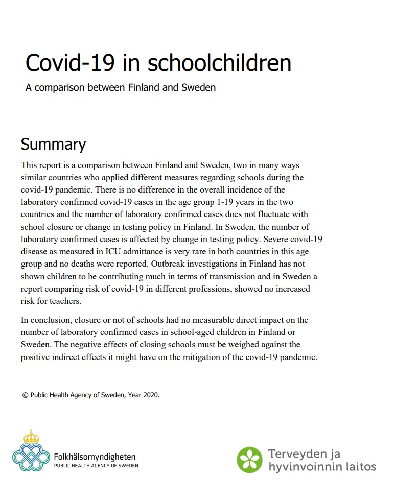 Folkhälsomyndigheten (2020) Covid-19 in schoolchildren – A comparison between Finland and Sweden. Zweedse gezondheidsautoriteit, 7 juli