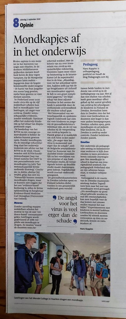 Zonder aarzeling stappen middelbare scholen het moeras in van de niet ‘evidence-based’ coronamaatregelen. Leerlingen worden geadviseerd of zelfs verplicht een mondkapje te dragen. Zo moeten ‘vooral de docenten extra beschermd worden’. Met de kennis van nu over transmissie van covid-19 een opmerkelijke redenering. Docenten lopen meer risico op besmetting in de lerarenkamer (of de supermarkt) dan in de klas. “Maandag, toen we het schooljaar openden, hadden zelfs 139 van de 140 brugklassers uit zichzelf een mondmasker opgezet. Ik heb ze een groot compliment gegeven”. De blijdschap van deze adjunct-directeur in het oosten des lands is potsierlijk door de onthutsende onwetendheid die erachter schuil gaat.
