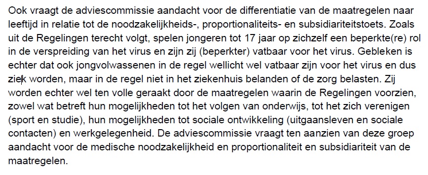 Onlangs wierp nota bene de Nederlandse Orde van Advocaten (NOvA) zich op als belangrijkste pleitbezorger voor de jongste generaties. De NOvA vraagt nadrukkelijk aandacht voor differentiatie van de maatregelen naar leeftijd. “Gebleken is dat jongeren in de regel niet in het ziekenhuis belanden of de zorg belasten. Zij worden echter wel ten volle geraakt door de maatregelen: onderwijs, sport en studie, hun mogelijkheden tot sociale ontwikkeling (uitgaansleven en sociale contacten) en werkgelegenheid.”