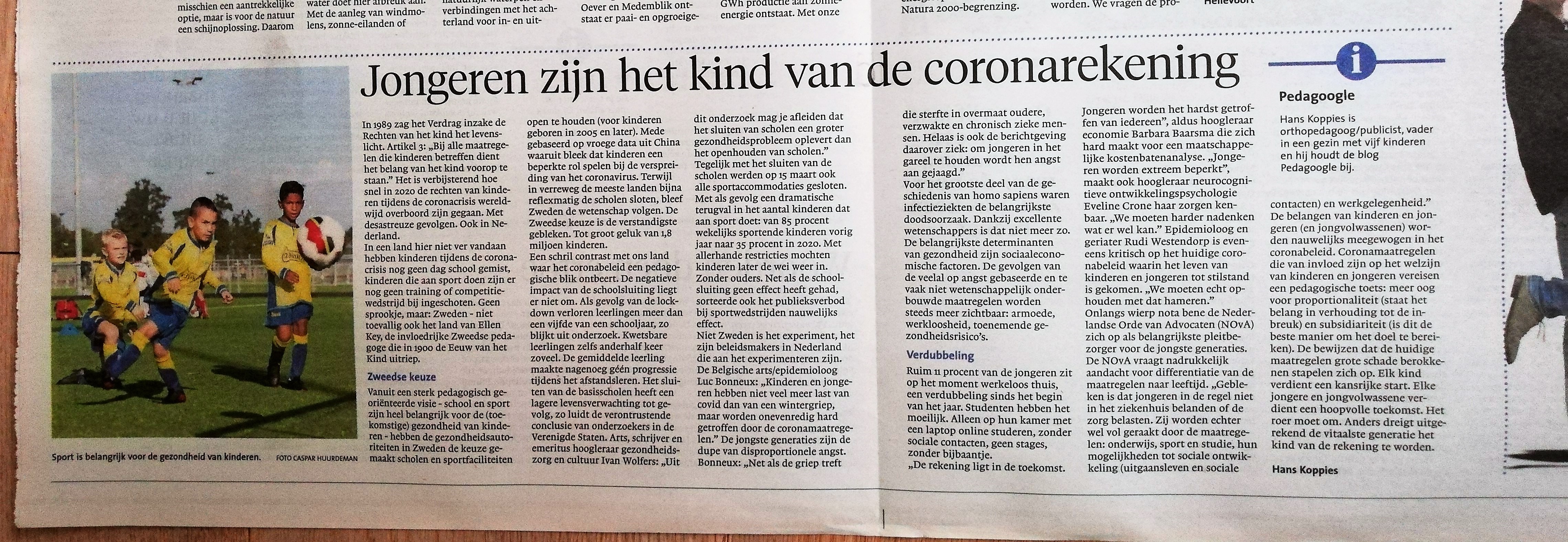 Dit opiniestuk is gepubliceerd in het Noordhollands Dagblad op 21 november 2020: Jongeren zijn het kind van de coronarekening