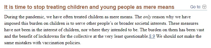 Abi-Jaoude, E. , Doshi, P., Michal-Teitelbaum. C. (2021) Covid-19 vaccines for children: hypothetical benefits to adults do not outweigh risks to children. BMJ, 13 juli
