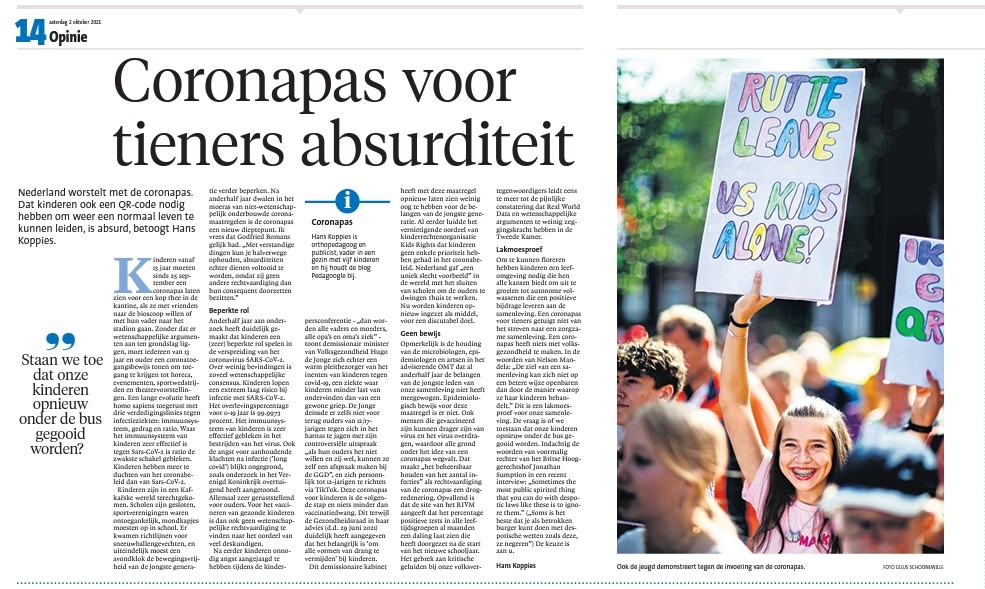Dit opiniestuk is gepubliceerd op zaterdag 2 oktober in Noordhollands Dagblad, Leidsche Courant, Haarlems Dagblad, IJmuider Courant en De Gooi- en Eemlander: Opinie: Dat kinderen een coronapas nodig hebben om normaal te kunnen leven is absurd