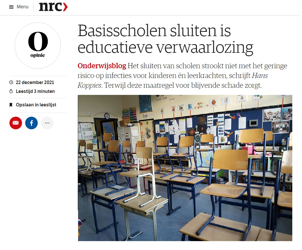 Dit opiniestuk is gepubliceerd in NRC Onderwijsblog op 22 december 2021: Basisscholen sluiten is educatieve verwaarlozing