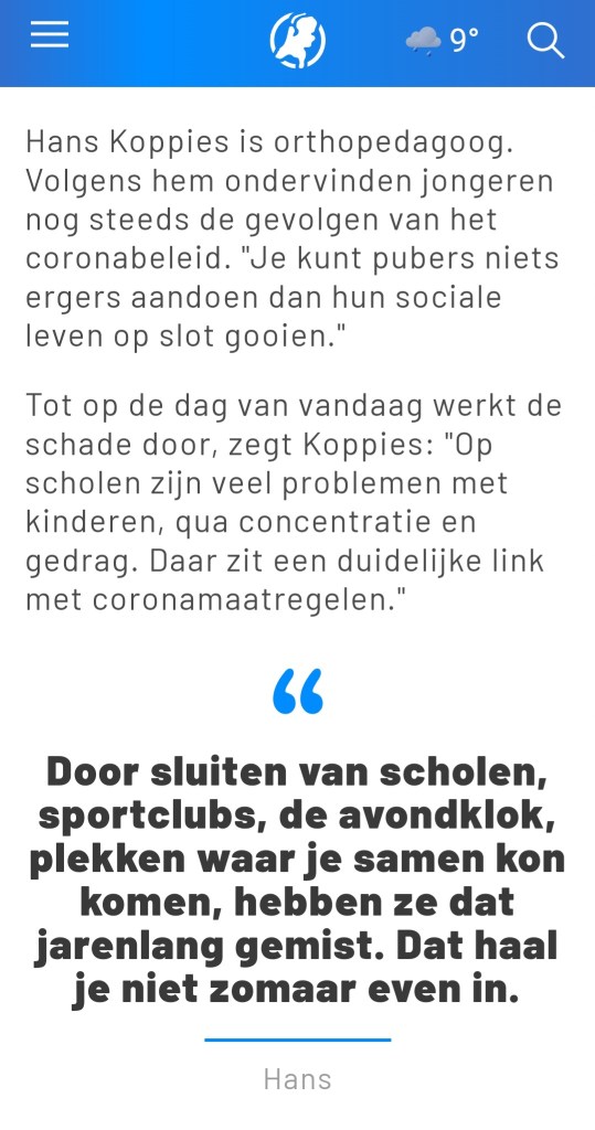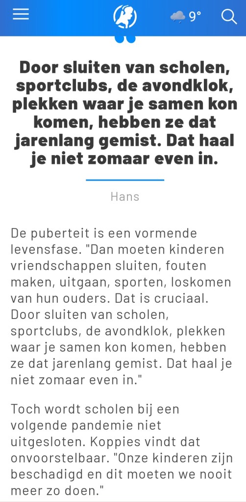 Voor Hart van Nederland kreeg ik van journalist Eva Munnik de vraag hoe ik tegen de lockdowns aankijk, en de gevolgen van de coronamaatregelen voor jongeren. Daar kan ik heel kort over zijn. Dit. Nooit. Meer. Lees vooral ook de twee ervaringsverhalen in dit artikel.