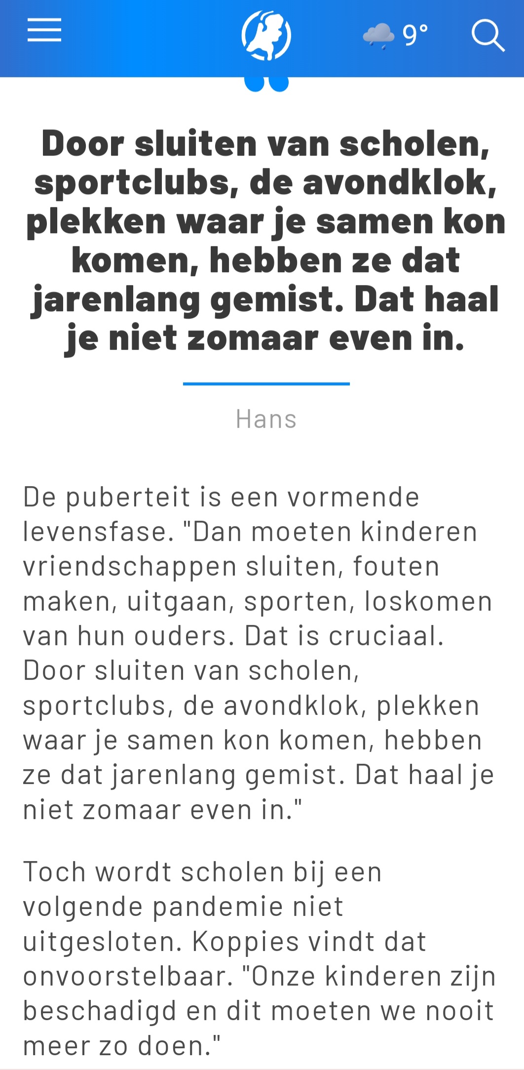 Toch wordt scholen bij een volgende pandemie niet uitgesloten. Koppies vindt dat onvoorstelbaar. “Onze kinderen zijn beschadigd en dit moeten we nooit meer zo doen.”