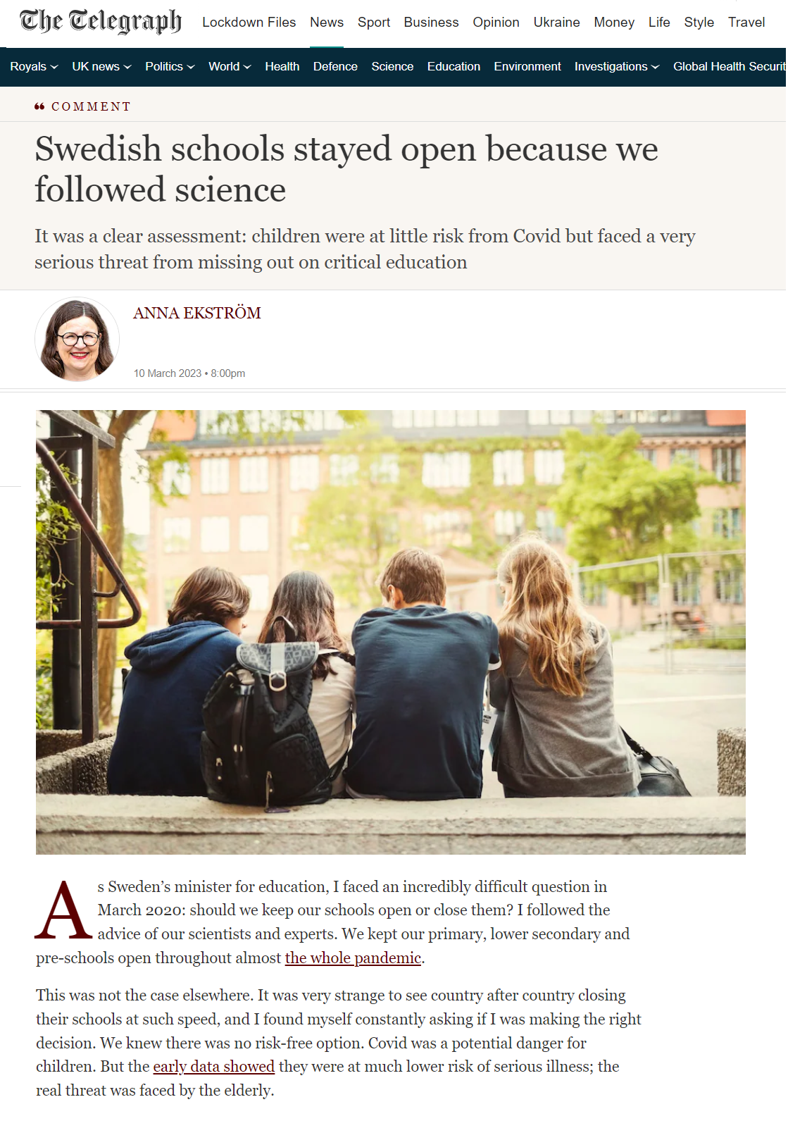 De voordelen van interventies moeten opwegen tegen de nadelen, dat geldt zeker voor kinderen. Scholen sluiten, mondkapjes, massaal testen, massale quarantaines – het nut van deze interventies is niet aangetoond. “De wereld is gek geworden”. Het was een zin die de architect van de Zweedse corona-aanpak Anders Tegnell in de loop van de pandemie zou blijven herhalen in de burelen van de Folkhälsomyndigheten. In de zomer van 2022 reageert de Zweedse minister van Onderwijs Anna Ekström op een artikel in The Economist waarin de desastreuze gevolgen van het sluiten van scholen wordt belicht (‘Covid learning loss has been a global disaster’). Met recht een historisch statement: “Scholen open houden toen andere landen ze sloten, was een buitengewoon moeilijke beslissing. In maart 2020 was de kritiek op mij hard omdat ik scholen en kinderdagverblijven niet had gesloten, maar ik was – en ben nog steeds – ervan overtuigd dat het de juiste beslissing is geweest”. Het gelijk van Zweden staat onomstotelijk vast.