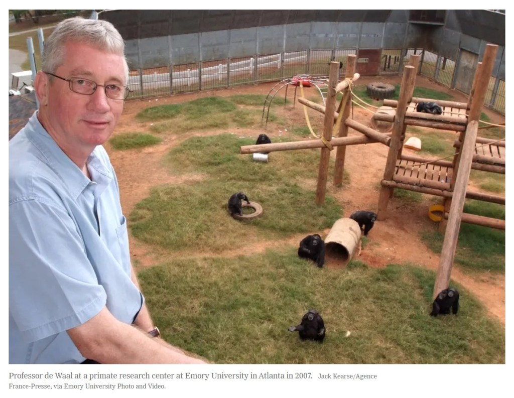 Het warme eerbetoon van Emory University – waar Frans de Waal in 2019 met emeritaat ging maar actief bleef – speekt boekdelen: Emory primatologist Frans de Waal remembered for bringing apes ‘a little closer to humans’ | Emory University | March 16, 2024