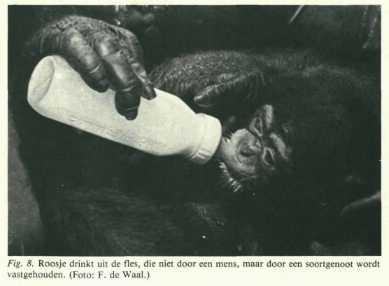 Foto: Aap geeft aapje de fles – Frans B.M. de Waal. In: De Levende Natuur (1980)